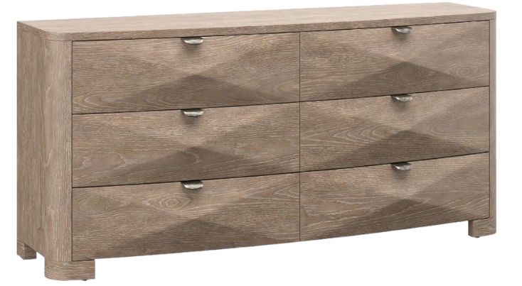 Dimensional pyramid shaping draws all eyes to the Aventura dresser. The design offers a curved front with six drawers with dimensional cast resin drawer fronts and metal tab pulls. A Marcona finish adds a chic but rustic look as the perfect final touch.Read More