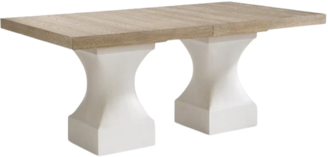 Sleek sculptural forms elevate the simple lines of the Aventura dining table. The table pedestals are formed with concave cast resin over a square base in our Tusk finish. The wood top, which includes two 20-inch leaves, offers a stunning contrast in the warm Marcona finish.Read More