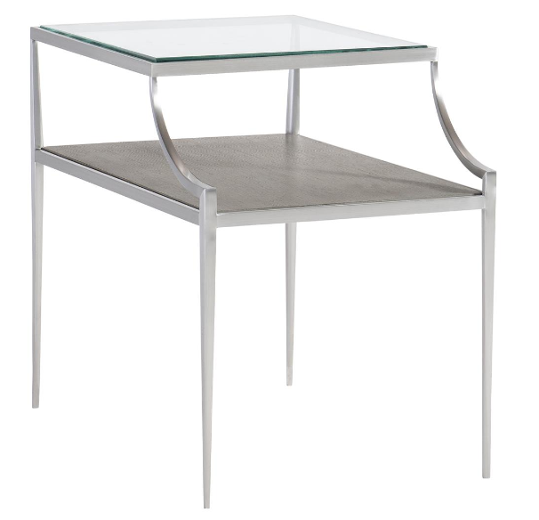 Metal frame in Brushed Stainless Steel finish with tempered, polished-edge glass top and one wood shelf in Nebbia finish