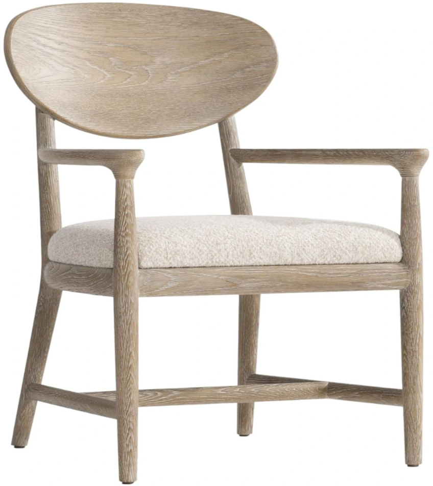 A curved back and shaped wood frame showcase the midcentury inspiration on the Aventura arm chair. The arms offer uniquely rounded hand rest while the rear legs stretch up to meet the back. An upholstered seat adds comfort and the wood frame takes a warm turn in a Marcona finish.Read More