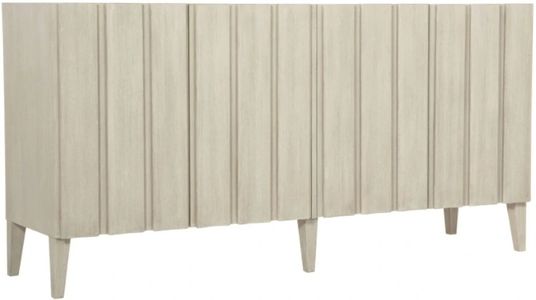 The East Hampton entertainment console features shaped vertical overlays, adding depth and dimension to the minimalist design. Quartered ash veneers feature a Cerused Linen finish, created using light wire brushing and cerusing techniques to highlight the linear wood grain.Read More