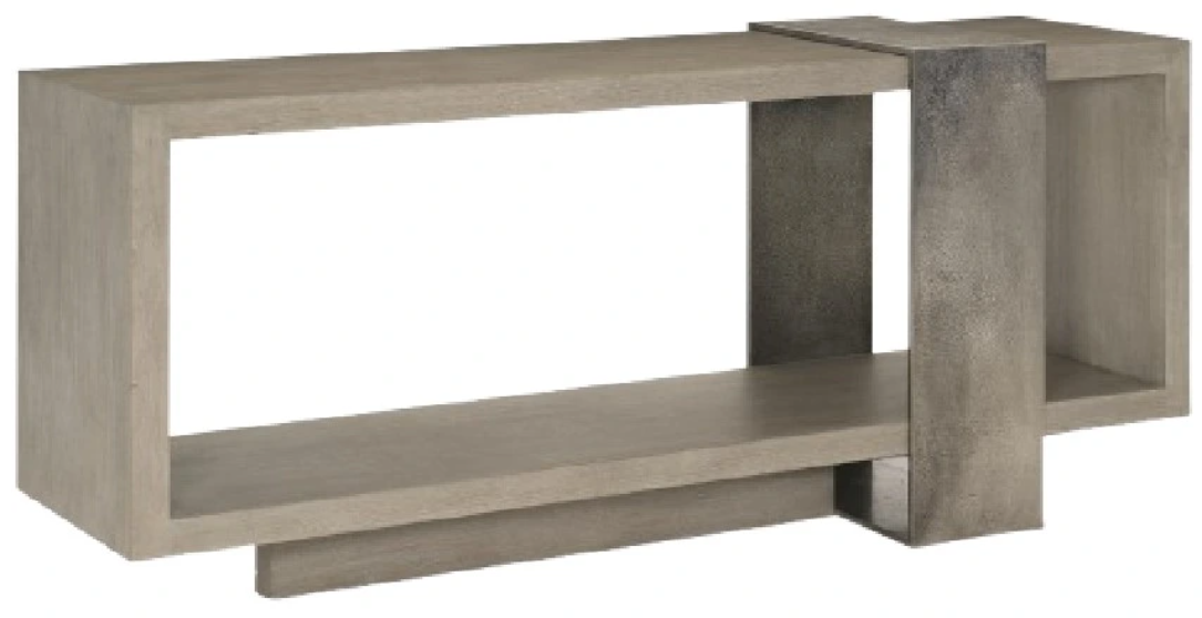 With an asymmetrical form and a unique mix of materials, the Linea console table achieves a singular look. The open case and plinth base feature wire-brushed oak veneers in a Cerused Greige finish. For a dramatic contrast, a heavily textured cast aluminum band wraps around the case.Read More