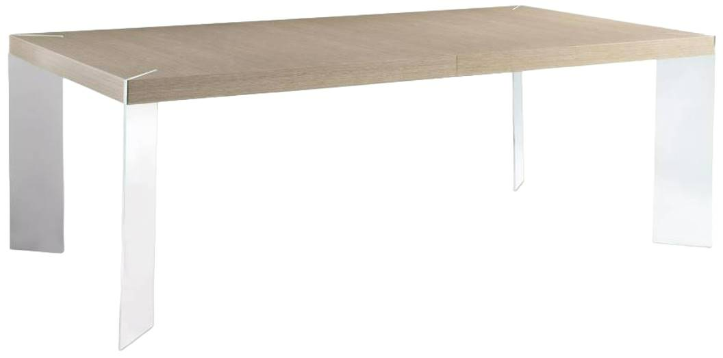 Dining table with white oak engineered veneer table top in Sahara finish, supported by four stainless steel blades in polished stainless steel finish.