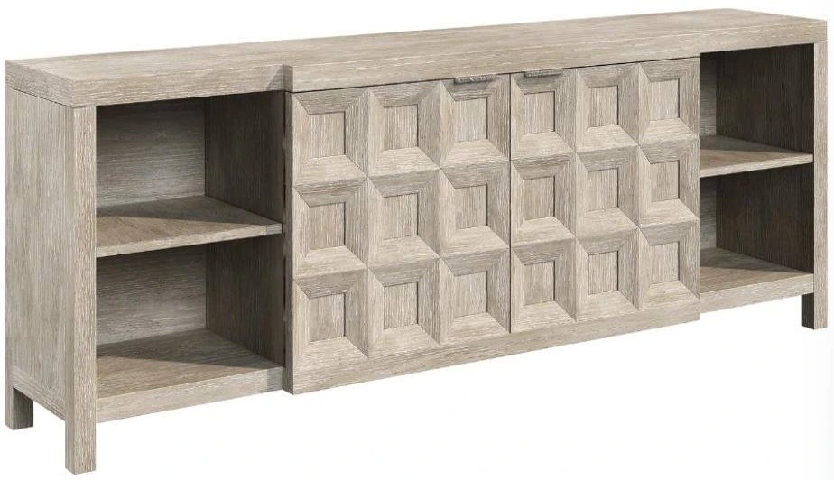 The Prado entertainment credenza offers architectural beauty with a coffered center section that has two soft-close doors. On either side is open shelving, each with one adjustable and removable shelf. Behind the center doors are adjustable and removable shelves, with the entire credenza finished in Tawny.Read More
