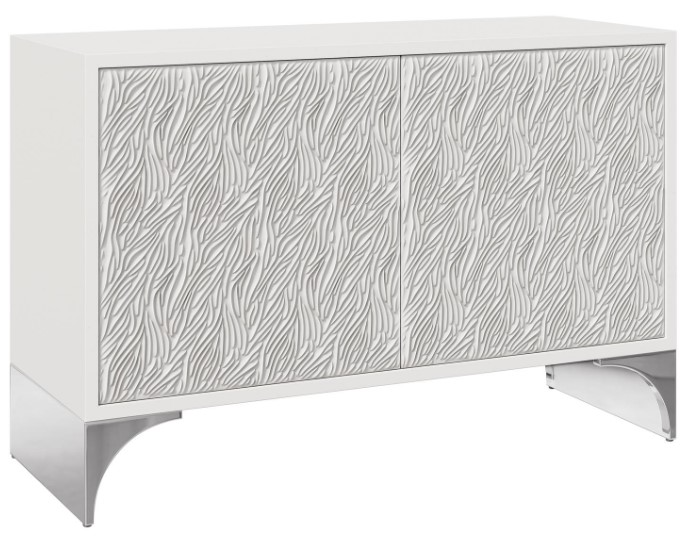 The Stratum door chest's sculpted cast resin door fronts showcase an intricate pattern inspired by the movement of wheat fields. Behind two pull-to-open, soft-close doors are shelves and a drawer. The sides and top are finished in a fossil white faux stone finish.Read More