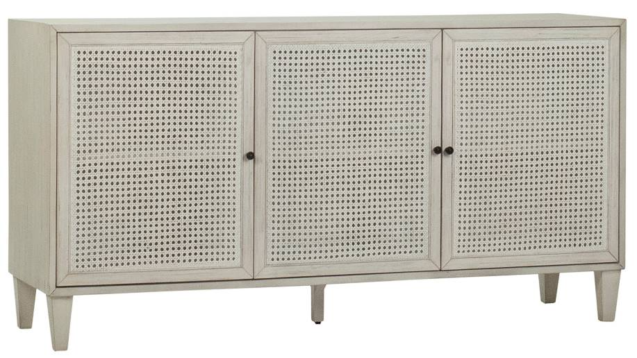 Perfectly designed to refresh your decor with modern, coastal flair. This 66" sideboard is made of acacia wood in an antique whitewash finish with rattan details in each door panel. Featuring three cabinet doors that open to four interior shelves that can accommodate dinnerware, electronics, or office supplies.Read More