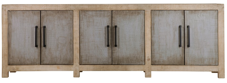 Crafted from reclaimed pine wood, this 109" long sideboard showcases the beauty of its natural texture in a minimalist design. Featuring two intentional wood cut-outs that add to its natural charm. Finished in a beautiful two-tone light warm wash color with grey wash door panels to add a warm statement to your dining space.Read More