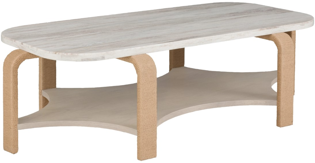 Crystal Wood grain marble top with polished egde. Rope wrapped legs and an oak shelf