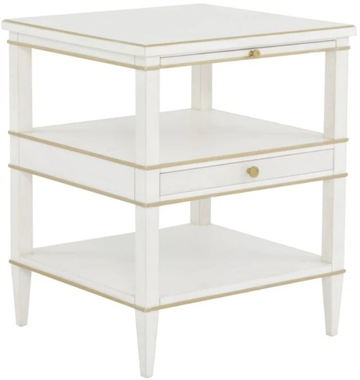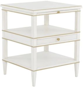 This versatile and storage-friendly collection includes a 24" square and 24" round end tables with pull out shelves and drawer, cocktail table with one drawer, and a console table with one drawer. Camille is stocked Linen or available in 40+ additional custom finishes via our Monogram Program.