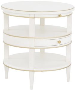 This versatile and storage-friendly collection includes a 24" square and 24" round end tables with pull out shelves and drawer, cocktail table with one drawer, and a console table with one drawer. Camille is stocked Linen or available in 40+ additional custom finishes via our Monogram Program.