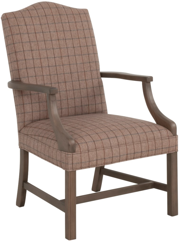 This occasional chair has a tight back shaped with a flowing arch. The tight seat is accented with a welted border. The exposed wood arms rest on a curved post flowing into the Chippendale legs.Read More
