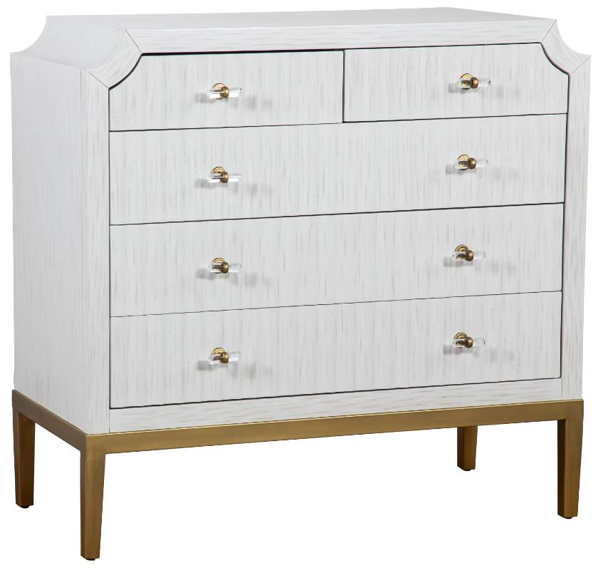 Five reeded-front drawers with self-closing drawer guides and acrylic and antique brass hardware