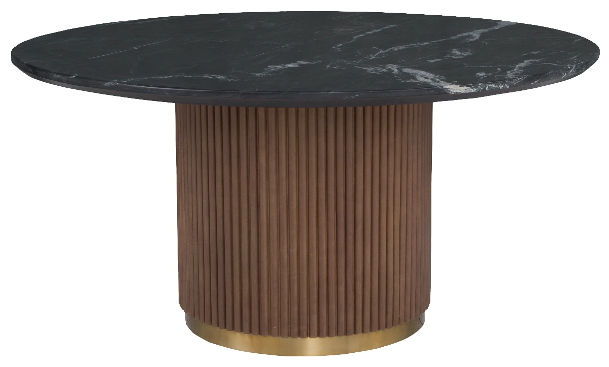 The Dimitri Round Dining Table is a striking piece with a contemporary design. It features a stunning black marble top with white veining, contrasted by a fluted, cylindrical wood base with a brass-finished bottom ring. This table makes a bold, luxurious statement.Read More