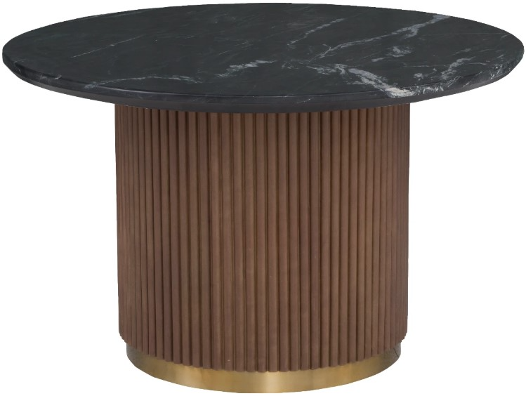 The Dimitri Round Dining Table is a striking piece with a contemporary design. It features a stunning black marble top with white veining, contrasted by a fluted, cylindrical wood base with a brass-finished bottom ring. This table makes a bold, luxurious statement.Read More