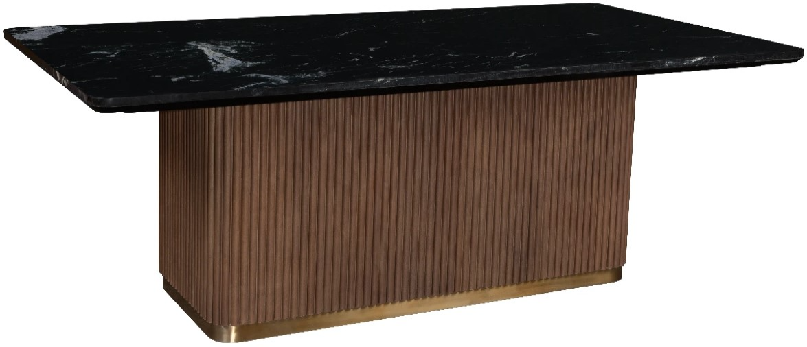 This rectangular dining table makes a modern, bold statement. It features a solid black marble top with delicate white veining, set upon a substantial, fluted wood pedestal base. A brass band at the bottom of the base adds a luxurious finishing touch.Read More