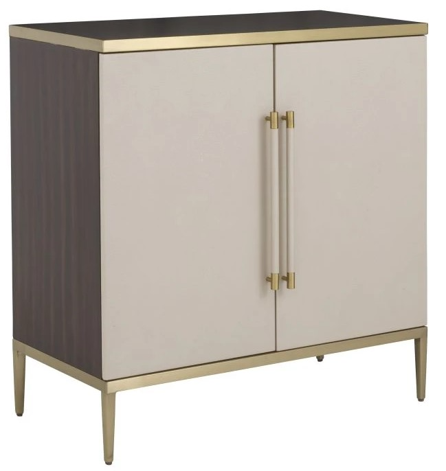 Hempstead Two Door Cabinet is a sleek and chic embellished storage piece finished in richly textured, in putty shagreen vinyl. The delicately tapered leg shape is highlighted by warm brushed brass details, shagreen wrapped door handles are elongated and oversized with brass tips.Read More
