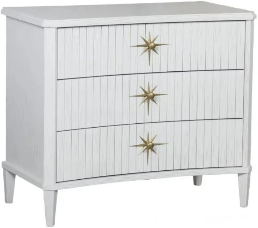 Three drawers with self-closing drawer guides and concave fluted drawer fronts with antique brass hardware.