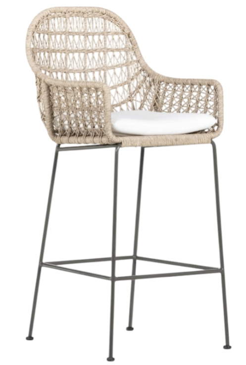Clean, contemporary shaping and an updated weave transform all-weather wicker into something modern. This high-texture bar stool is supported by a contrasting bronzed iron base, with a white seat cushion for comfort.Read More