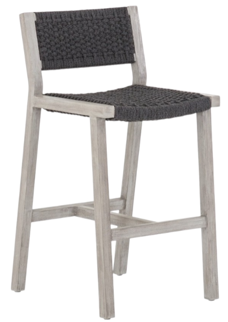 A textural take on outdoor bar styling, weathered grey teak welcomes thick, handwoven rope seating in an inviting grey. Safe for outdoor spaces. Cover or store indoors during inclement weather and when not in use.Read More