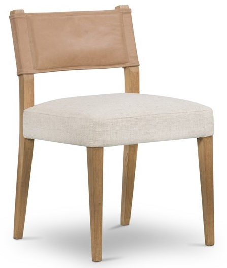 Mixed materials at their finest. Solid parawood forms a slight, simple frame for squared seating upholstered in high-performance fabric. Tan top-grain leather backing takes this modern-minded dining chair to the next level. Performance fabrics are specially created to withstand spills, stains, high traffic and wear, ensuring long-term comfort and unmatched durability.Read More
