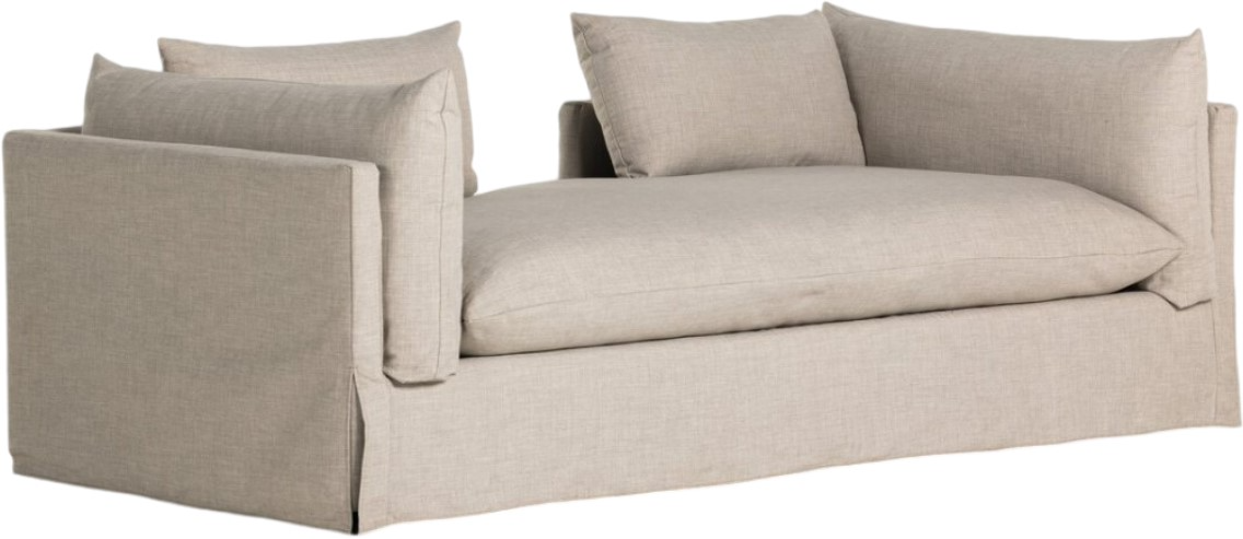 This chaise features a soft moon-colored slipcover and a comfortable, cushioned seat. Its sleek design and cover make it easy to maintain and stylish, perfect for relaxing and fitting into various décor styles.Read More