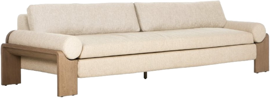 Heavy wood meets upholstery in this outdoor sofa. Loose bolsters cradle the fixed seat, adding a playful element to this bold, angular frame. The monochromatic look of textural beige fabric and washed brown FSC®-certified teak ground the piece, accented with wide leg proportions and a box edge loose back pillow.Read More