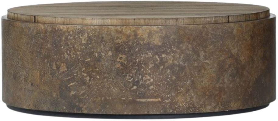 A drum-style table is wrapped in distressed aluminum with a rust finish, for a unique acid-wash effect. Topped with resawn oak which has been sun-bleached and torch-burned for both texture and character.Read More