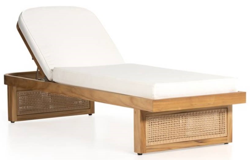 The cane trend moves outdoors. Rattan-inspired woven panels accent a rounded chaise frame crafted of FSC®-certified teak. Thick rounded edge cushioning is covered in 100% Olefin, known for its UV-resistant, water-repellent, quick-drying abilities. Cover or store indoors during inclement weather and when not in use.Read More