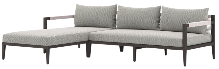 Modern materials ready a stylish silhouette for the outdoors. Bronze-finished aluminum forms a linear frame for UV-resistant and water-repellent Sunproof fabric in an inviting ash. Rope-wrapped armrests and rear cotton weaving add a textured finishing touch. Right arm facing chaise sectional. Cover or store indoors during inclement weather.Read More