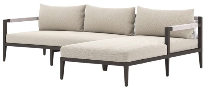 Modern materials ready a stylish silhouette for the outdoors. Bronze-finished aluminum forms a linear frame for UV-resistant and water-repellent Sunproof fabric in an inviting ash. Rope-wrapped armrests and rear cotton weaving add a textured finishing touch. Right arm facing chaise sectional. Cover or store indoors during inclement weather.Read More