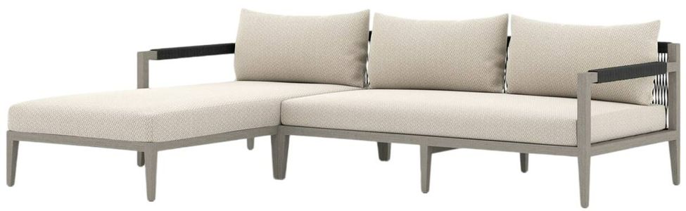 Modern materials ready a stylish silhouette for the outdoors. Solid FSC-certified teak forms a clean frame for UV-resistant, water-repellent Sunproof fabric on this two-piece outdoor sectional. Rope-wrapped armrests and rear cotton weaving add a textured finishing touch. Cover or store indoors during inclement weather.Read More