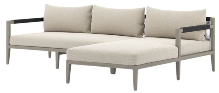 Modern materials ready a stylish silhouette for the outdoors. Solid FSC-certified teak forms a clean frame for UV-resistant, water-repellent Sunproof fabric on this two-piece outdoor sectional. Rope-wrapped armrests and rear cotton weaving add a textured finishing touchRead More