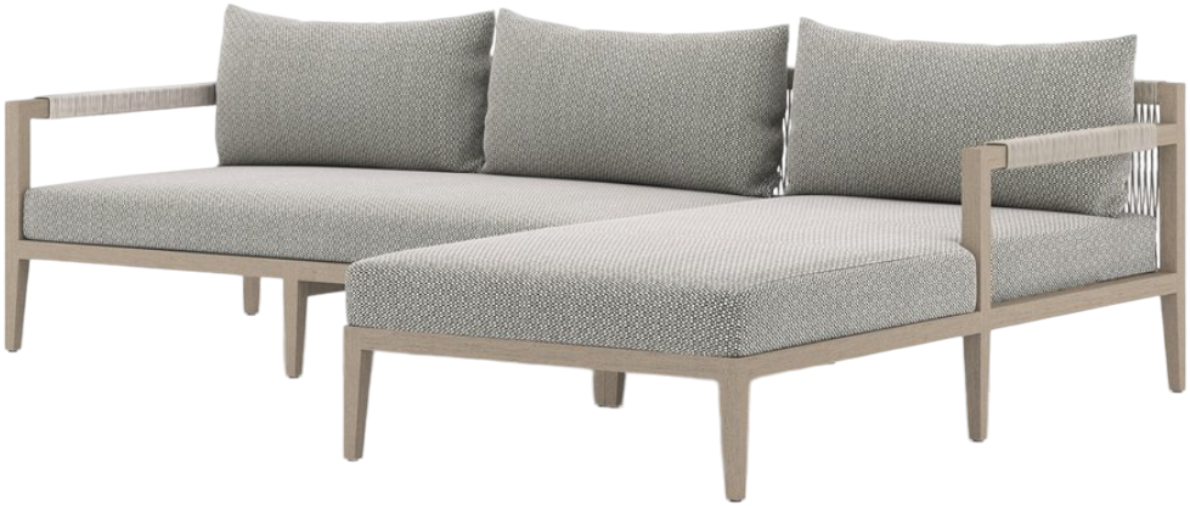 Modern materials ready a stylish silhouette for the outdoors. Solid FSC-certified teak forms a clean frame for UV-resistant, water-repellent Sunproof fabric on this two-piece outdoor sectional. Rope-wrapped armrests and rear cotton weaving add a textured finishing touch. Cover or store indoors during inclement weather.Read More