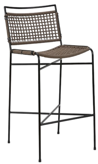 Slim lines and mixed materials combine in this outdoor bar stool. Two-toned woven rope detailing forms a sling-style seat and back, accented by iron framing. Cover or store indoors during inclement weather and when not in use.Read More