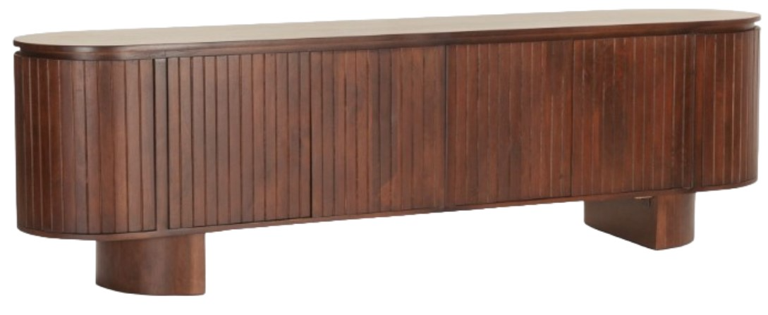 Crafted from solid mango wood, this media cabinet showcases a beautiful natural grain pattern, and its rich, aged mahogany finish complements the overall design.