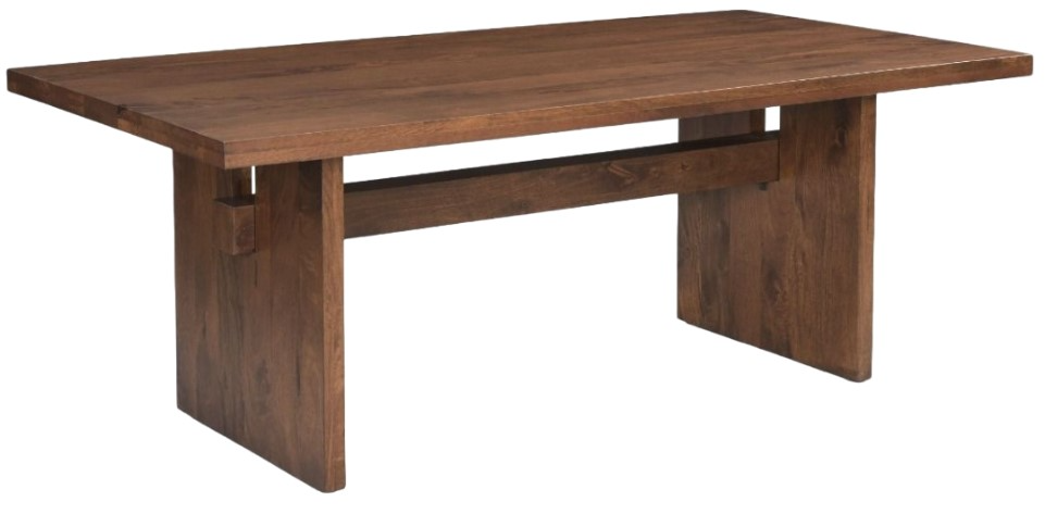 The Cosmopolitan 82" Dining Table in Honey Brown features a contemporary, minimalist design with thick slab legs and a through-tenon construction, where the horizontal support bar visibly passes through the legs, adding a handcrafted and sturdy aesthetic. The clean lines and warm wood tone give it a modern appeal, perfect for various dining spaces.Read More