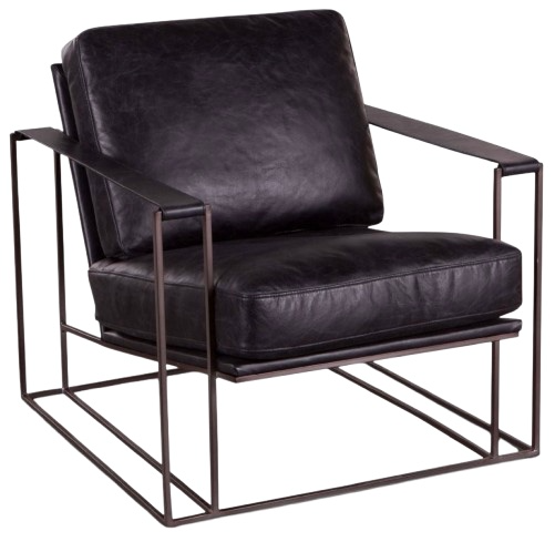 Armchair is upholstered in 100% top grain, black cowhide leather that is slightly distressed