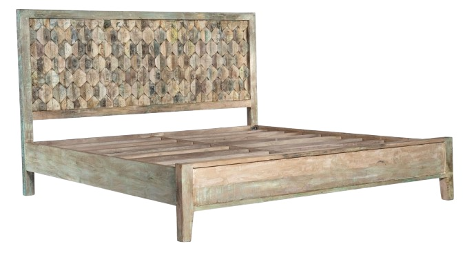 Across the front of the headboard is a unique, geometric design of hexagon-shaped teak wood pieces that fit together in a simple yet intricate pattern