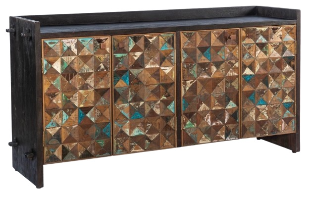 Carved reclaimed teak wood cabinet doors that feature multi-color painted elements, making each piece unique