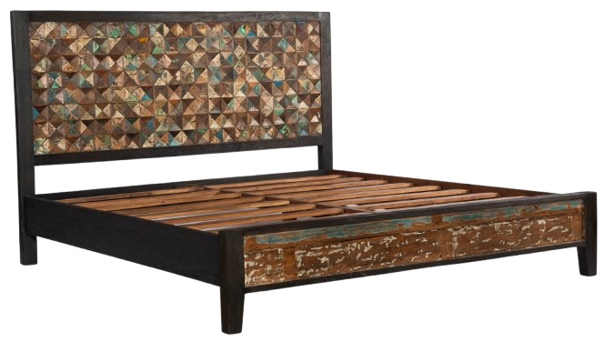 Carved teak wood headboard and footboard with multi-color elements, making each piece unique