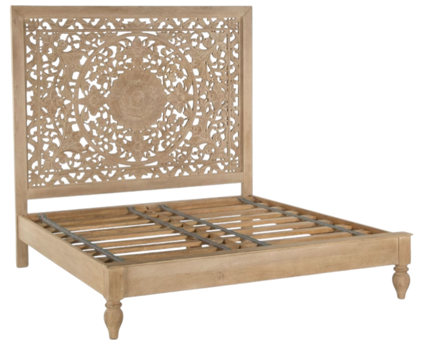 Headboard features floral and leaf detailing hand-carved by experienced artisans in the wood