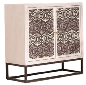 The charolette cabinet group is constructed, using tongue and groove joint methods, of mango wood in our water resistant lacquer sealed washed white finish. The framed door fronts feature striking designs of hand set bone inlay in shades of gray and off-white -over mdf for stability.Read More