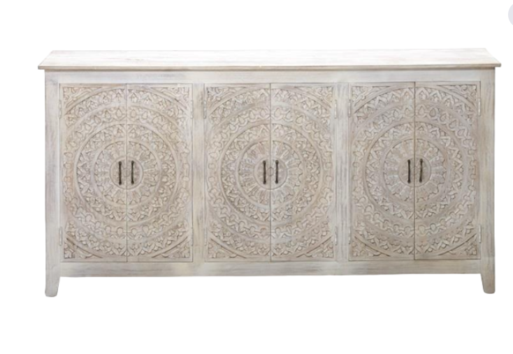 The Carved Lace group is constructed of mango timber with a water-resistant lacquer sealed white wash finish. An impressive 94 inches long, the UCS-6640 boasts carved and routed details and a shelved interior behind six doors.