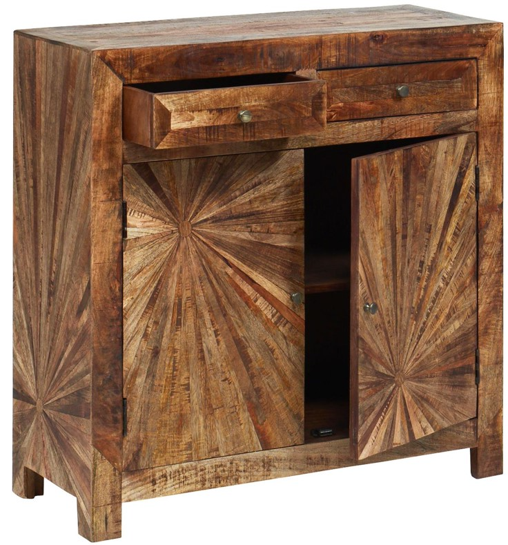 Constructed of mango wood and features a burnished hand-distressed finish