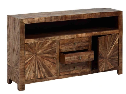 The Cayley group is constructed of mango wood and features a burnished hand-distressed finish. A solid case is built, and then the pinwheel effect is achieved using additional strips and circles of wood painstakingly hand set in a pleasing pattern.Read More