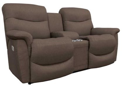 The roomy James power reclining loveseat with headrest, lumbar, and console has cozy cushioning and laid-back style. Plush bucket chaise seats, pillowy backs and armrests, and power-adjustable head-to-toe support let you refine comfort in this haven for two!Read More