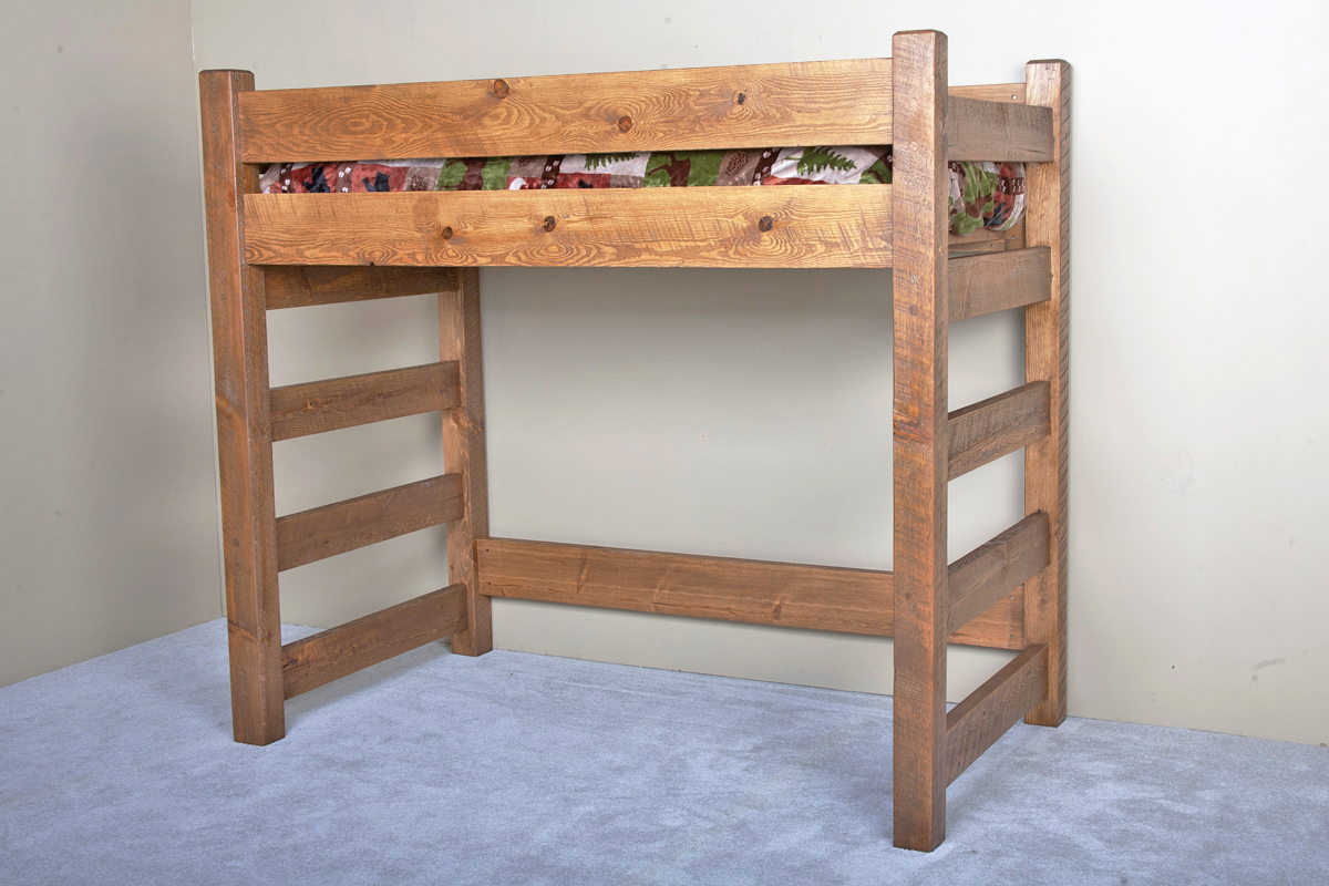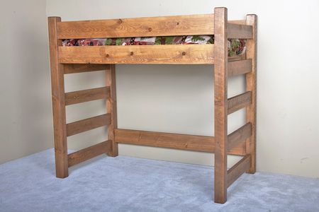 The barnwood loft is constructed using rough sawn pine timbers to replicate the look of barnwood at an affordable price. It’s a versatile solution for a small room. There is plenty of space underneath the loft for a dresser, a desk, or even another bed. There are so many options! There are built in ladders on both ends of the loft. All our rustic wood bunk beds and lofts meet the entrapment safety standard requirements. We recommend 9-10" thick mattresses for all bunk beds. Dimensions shown here are for the twin XL but this loft is also available in a twin.Read More