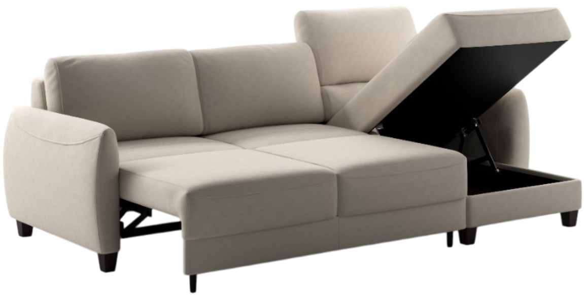 The Delta's Flip Function mechanism represents advanced sofa bed technology, providing seamless transformation between configurations. The precision-engineered system ensures stability while offering practical storage solutions within the reversible chaise.