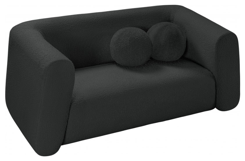 Give your room a new look with the chic Abbington loveseat in stunning black boucle fabric. Embrace the richness of its texture and the boxy, geometrically inspired design that adds a touch of contemporary flair. This loveseat is not just furniture; it's an aesthetic experience.Read More
