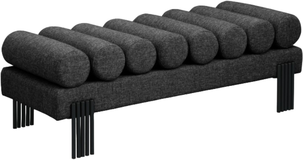 Revitalize your seating area with this stunning black Akeela linen textured fabric bench featuring a rolled cushion top. Upholstered in rich black linen textured fabric, this bench delivers both comfort and sophistication and features matte black metal legs to provide sturdy support while adding a modern touch to its art deco design.Read More